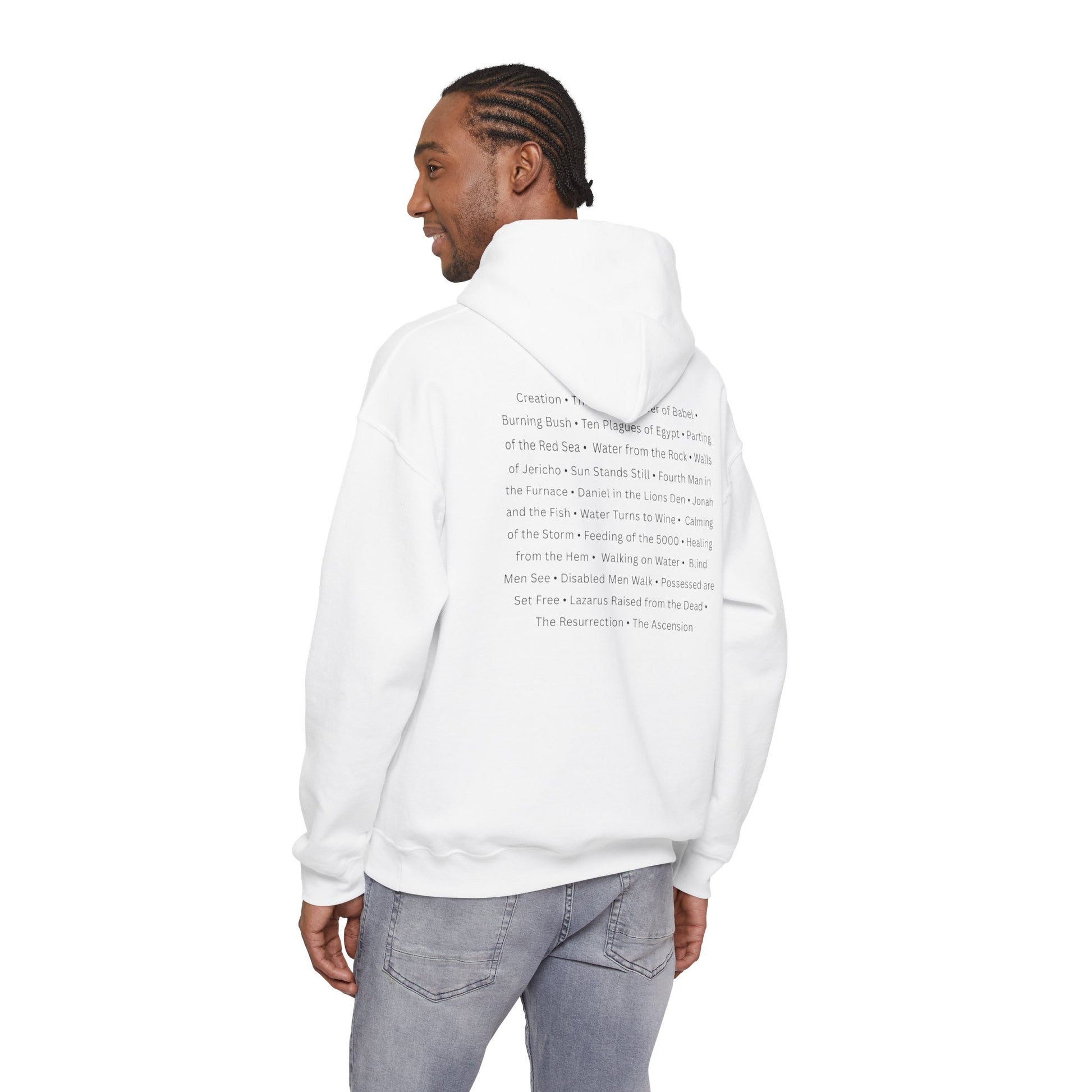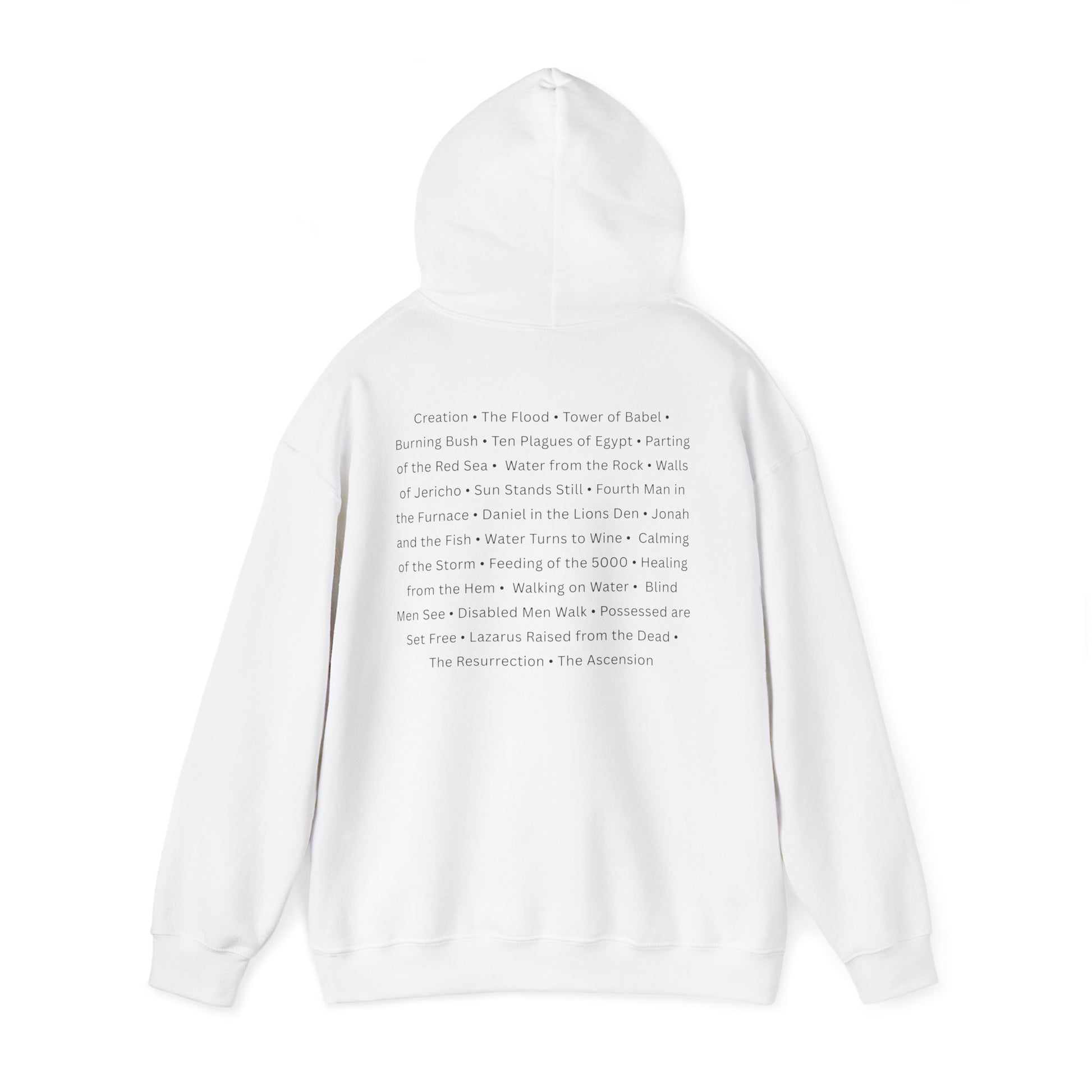 This sweatshirt wears like a quiet sermon — steady, warm, and full of stories. The back lists major biblical miracles in clean, readable type, inviting reflection with every step. It’s heavyweight and soft against the skin, the hood and kangaroo pocket adding the comfortable, familiar silhouette you reach for on cool mornings or long evenings of study and fellowship. The printed miracles aren’t flashy; they feel like pages from a well-loved Bible, a wearable reminder of faith moments that shaped a life. Wear it to Bible study, fellowship nights, volunteer meetups, or while curling up with scripture at home. It fits into the rhythm of a faith-centered life: thoughtful, durable, and quietly expressive.